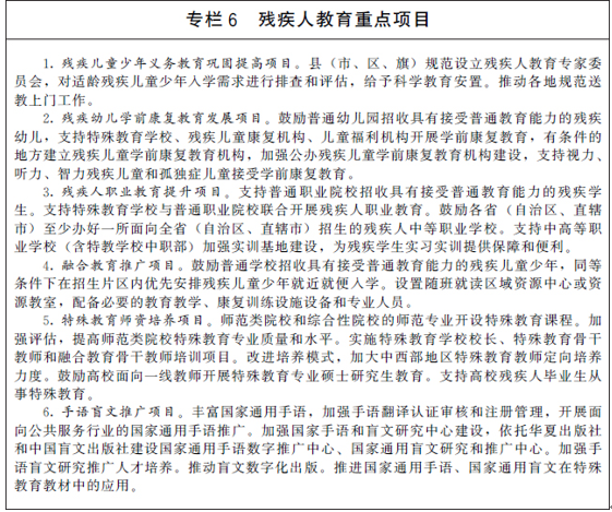 巩固提高残疾儿童少年义务教育水平,加快发展非义务教育阶段特殊教育。健全普通学校随班就读支持保障体系,发挥残疾人教育专家委员会作用,实现适龄残疾儿童少年“一人一案”科学教育安置。发挥高校等机构特殊教育专业优势,建设国家和省级特殊教育资源中心(基地)。各省(自治区、直辖市)根据残疾学生规模、类型、分布等情况,因地制宜合理配置特殊教育资源。