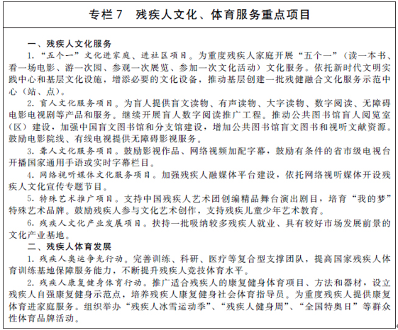 鼓励残疾人参加“书香中国·阅读有我”等公共文化活动,持续开展“残疾人文化周”、“共享芬芳·共铸美好”等残疾人群众性文化艺术活动,推动基层创建一批残健融合文化服务示范中心(站、点),不断满足残疾人文化需求、增强残疾人精神力量。筹办好北京冬残奥会,实现“简约、安全、精彩”目标。实施残疾人奥运争光行动,不断提高竞技水平,在北京冬残奥会和东京残奥会等重大国际赛事上力争好成绩。