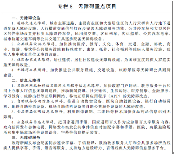 保障残疾人平等权利,为残疾人提供无障碍环境和便利化条件。新建设施严格执行无障碍相关标准规范。在乡村建设行动、城市更新行动、城镇老旧小区改造和居住社区建设中统筹推进无障碍设施建设和改造。城市道路、公共交通、社区服务设施、公共服务设施和残疾人服务设施、残疾人集中就业单位等加快开展无障碍设施建设和改造。提高残疾人家庭无障碍改造水平。加快推广无障碍公共厕所。探索传统无障碍设施设备数字化、beplay下载软件 化升级。开展无障碍市县村镇达标验收工作。提高无障碍设施规划建设管理水平,推进无障碍设计设施认证工作,提高全社会无障碍意识,加强无障碍监督,保障残疾人、老年人等通行安全和使用便利。