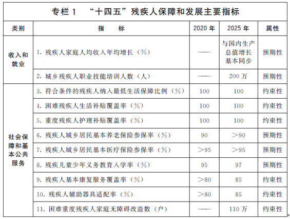到2025年,残疾人脱贫攻坚成果巩固拓展,生活品质得到新改善,民生福祉达到新水平。多层次的残疾人社会保障制度基本建立,残疾人基本民生得到稳定保障,重度残疾人得到更好照护。多形式的残疾人就业支持体系基本形成,残疾人实现较为充分较高质量的就业。均等化的残疾人基本公共服务体系更加完备,残疾人思想道德素养、科学文化素质和身心健康水平明显提高。无障碍环境持续优化,残疾人在政治、经济、文化、社会、家庭生活等各方面平等权利得到更好实现。残疾人事业基础保障条件明显改善,质量效益不断提升。