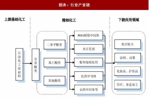 芳香族酮类(也称“芳香酮”)是指含有羰基的芳香族化合物,一般是液体或固体,化学性质活泼,能与亚硫酸氰钠、氢、氨等发生加成反应,芳香酮不能被弱氧化剂氧化,具有较大的工业价值,是重要的有机化工原料,在塑料、化妆品、医药、农药、染料及涂料等领域都有广泛的应用。芳香族酮类系列产品制造是一个专业的精细化工领域,需要企业具备特殊的生产技术和全面的工艺研发技能,有着较高的技术门槛。芳香酮作为精细化工行业中有机化学原料,下游覆盖领域广泛,各大细分领域的飞速发展都将进一步驱动芳香酮行业的繁荣。