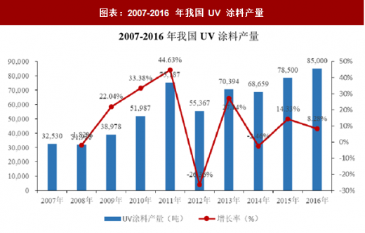 我国的光固化材料直到二十世纪 90 年代才开始工业化生产,进入 21 世纪以来,我国的光固化材料产业得到迅猛发展,近年来每年以 25%以上的速度增长,正成长为全球第一大消费区。根据辐射固化协会的不完全统计,2014 年我国 UV 涂料产量为 68,659 吨,比 2007 年增长一倍多。2015 年我国 UV 涂料总产量为 7.85 万吨,总产值为 36.4 亿元。2016 年我国 UV 涂料总产量为 8.50 万吨,总产值约为 51.3 亿元,同比增长 40.93%。但国内 UV 涂料在涂料总量中所占比例依然很低,2014 年国内涂料总量为 1,648.19 万吨,而国内 UV 涂料产量仅为 6.87 万吨,占比为 0.42%,2016 年 UV 涂料产量也只占国内涂料总量的