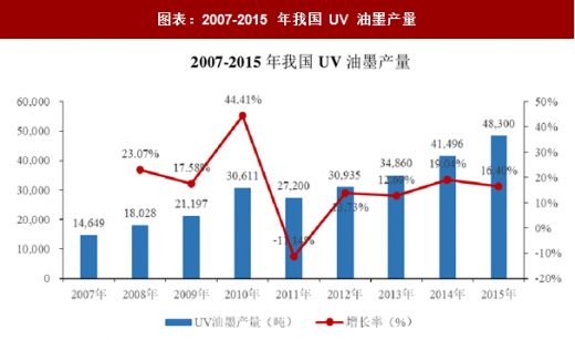 我国 UV 油墨的市场虽然起步较晚,但近年来伴随着技术进步及国内巨大的需求正处在持续增长阶段。根据中国辐射固化协会的不完全统计,2012-2015 年我国 UV 油墨产量依次达到 30,935 吨、34,860 吨、41,496 吨、48,300 吨,同比增长率依次为 13.73%、12.69%、19.04%、16.40%。
